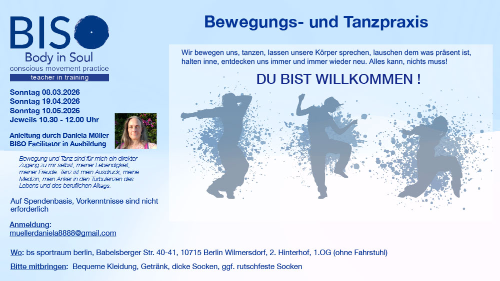 Wir bewegen uns, tanzen, lassen unsere Körper sprechen, lauschen dem was präsent ist, halten inne, entdecken uns immer und immer wieder neu. Alles kann, nichts muss!